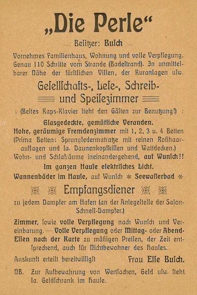 Unser Haus wurde im Jahr 1905 als Stadtvilla fertiggestellt und als „ gehobene Pension“, Die Perle, von unserer Großmutter, Frau Elsa Busch, betrieben.